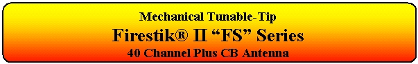 The "FS" antennas are 100% American made with 100% American materials. To maintain a balance between flexibility and ruggedness, we use a custom blended, high count, glass fiber reinforced shaft. And we do not use performance robbing, copper-clad steel wire on any of our antennas. Each is wound with heavy insulated, solid copper wire to prevent the oxidation and shorted windings often found on non-Firestik antennas. The tunable tip mechanism has a rubber o-ring to hold the adjuster in place after tuning. Our 3/8"-24 threaded base has a tapered contact point that works especially well with Firestik mounts and accessories. The tapered "lug-nut" effect transfers stress away from the threads and reduces the possibility of vibration induced loosening of the antenna in its mount. Each antenna is covered with a static reducing, water-tight sleeve containing UV and pigment stabilizers. All "FS" series antennas are factory bench tested for resonant frequency and overall quality. They are available in four (4) standard colors .. Black or White with a red tip, or Red or Blue with a white tip. WHERE TO BUY? And don't forget ... ALL antennas, regardless of style or manufacturer, MUST be tuned after installation on the vehicle. Transmitting antennas are not "plug-n-play" devices. Read our article regarding this matter. Also, visit our technical library to find the answers to your most common questions or to learn how to troubleshoot and tune your CB antenna. It is unique on the Internet!
