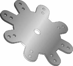 The "Hobby-Hub" is great for antenna hobbyist to carry on their trade. You can use one to build a counterpoise for your antenna or two when designing discone antennas. The hub is made from 0.100 (2.6mm) plated steel. The inner circle diameter is 3.5" (89mm) and the outer diameter is 5" (127mm). The center hole is 0.5" (13mm) to accept standard antenna stud mounts. Each of the eight ears protrude 0.75" (19mm) from the center circle and have two radial mounting holes with a diameter of 0.170" (4.3mm) in order to use #10 machine screws for mounting. WHERE TO BUY?