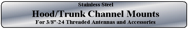 Designed for hood and trunk applications, these stainless steel mounts go on the inside channel of your hood or trunk. There are no visible mounting holes required. All mounting hardware (also stainless steel) is hidden inside the hood or trunk channel. Includes four #12 x 1/2" Philips panhead stainless steel sheet metal screws (use a #20, 0.161" drill for the screw pilot holes). Mount comes complete with antenna mounting stud. Click here to see installation line art. The SS-174 fits well in the deeper hood channels found on many of the newer Ford and Chevy pick-ups. This mount isn't limited to pick-ups. It can be used on just about any vehicle with a hood and/or trunk. The bracket measures 2.9" (74cm) from the mounting base to the top of the bracket itself. The height from the mounting base to the first bend is 2.1" (53mm) so it can be used on channels with depths up to 2" (51mm). This bracket is also available in one of our cable/mount mini-kits. See MK-174. Click here to see dimension details. Use this mount with heavy-duty Firestik, FireFly or RoadPal antennas up to 48" (122cm)