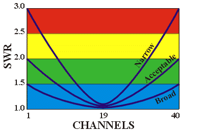 As in most matters involving the technical side of antennas, "SWR" can be complex beyond the understanding and concern of many radio communicators. In this discussion we will attempt to simplify the SWR subject. If you need or want more detailed information, there are plenty of good books that are loaded with antenna testing information. In the meantime, this information will help the newcomer understand the basic concept. "SWR" is the common abbreviation for "Standing Wave Ratio". It may, in some circles, be referred to as "VSWR (voltage standing wave ratio). Never the less ... it is the same. For the most part the term has been reduced to SWR since the calculation can involve either voltage or current. The voltage/current is measured in a transmission line scenario that involves a source (in this case, a radio capable of transmiting radio signals) and a load (everything from the coaxial connector at the radios output to the end of the antenna). In simple terms ... SWR compares the maximum amount of voltage or current that can be delivered by the radio to the minimum voltage or current that actually leaves via the transmission line and antenna. If everything, from the radio end connector to the base of the antenna is perfect, and if the antenna is perfectly tuned to the testing frequency, SWR will be 1:1. That is, every bit of power that the radio has to deliver is leaving the radio. For frequencies below 200 MHz (CB, VHF, etc), SWR below 2.0:1 is acceptable. Granted, lower SWR means more power leaving the radio but, at 2.0:1 the loss does not amount to more than 1/2 dB, even on very long transmission lines. A loss of 1/2 dB is an undetectable change in actual signal strength. Short of having an easy to tune antenna, fighting to achieve SWR in the 1.3:1 to 1.6:1 range when it is already at 2.0:1 probably isn't worth the time and effort. Many people believe that SWR only involves the antenna but that is an inaccurate assumption. When you place an SWR meter between the radio and the antenna it cannot decipher one component from another. A defective connector, bad coaxial cable, faulty or improperly installed stud mount or a defective and perhaps untuned antenna may all return the same results on the meter. Not only that, but how the antenna is mounted will also play a big part in the resulting SWR readings. For instance, on a ground-plane dependent mobile antenna, if the mount doesn't have a chassis ground the results could be higher than expected SWR. Just as well, if the antenna is mounted on the vehicle in a way that hampers its ability to radiate the applied energy into free space, you will experience less than optimum SWR. Antennas, for the purpose of this discussion, will only be resonant at one primary frequency. For example, on a 40 channel CB, channel 19 is the center frequency (27.185 MHz). If the antenna is tuned to be resonant on channel 19, the further away from that channel you are, the higher the SWR will be. On occasion you may hear someone say the "SWR should dip at the center frequency". With the antenna tuned at channel 19, if you were to plot the SWR from channel 1 to channel 40, the results would be curved line with both channel 1 and channel 40 being equal but higher than channel 19. The steepness of the line as it leaves the center frequency indicates the bandwidth of the antenna. The flatter the line, the broader the bandwidth. See the following chart for visual assistance. |