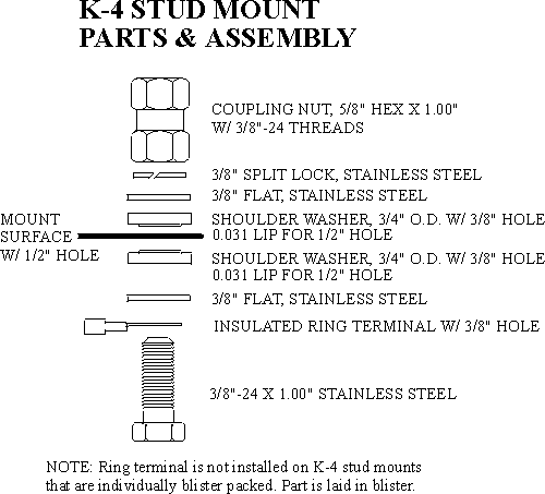 The importance of the stud mount cannot be over stressed! The antenna stud mount acts as a bridge between the antenna and the coaxial feedline. Accordingly, it needs to allow for efficient transfer of your transmitted and received signals to and from the transceiver. If the stud mount doesn't perform that task efficiently you end up with unneeded loss. And if that isn't enough, the stud mount must be strong enough to withstand all of the stress placed upon it from an antenna that is subject to severe wind load and vibration. Firestik stud mounts have become the standard of our industry. This wasn't by accident. It was because users learned to appreciate their outstanding design and material quality. Instead of inexpensive aluminum, we use chrome plated machine brass. Instead of 9/16" (14mm) hex-stock, we use 5/8" (16mm) stock. Instead of ABS or inferior plastic insulators, we use nylon. Instead of cadium plated hardware, we use stainless steel. Furthermore, our heavy-duty 3/8" center shanks can mean the difference between trouble free use and lost antennas. Some businesses in the industry have copied the look of the Firestik antenna studs but those "low-cost targeted" parts have a tendancy of coming apart. It is buyer beware! You might save a dollar when you buy them and you might loose a $25+ antenna as your reward. The K-4 stud utilizes ring terminal connectors (supplied)making it compatible with non-PL-259 terminated coaxial cables. In a typical installation, antennas with 0.600" (15mm) of exposed threads can be used without the fear of bottoming out before proper tightening is accomplished. The K-4 can be used in any mount or mounting surface with a 1/2" (13mm) hole. Click here to see parts and assembly of the K-4. Our model K-4A stud mount has been praised by communications professionals for 20 years. You can actually pay more for a stud mount but you certainly will not get more than what the K-4A offers. The K-4A should be used whenever a PL-259 terminated coax cable is to be used (K-8A, K-9A, R-8A, R-9A). Like the K-4, this stud is designed for 1/2" (13mm) holes. In a typical installation, antennas with 0.680" (15mm) of exposed threads can be used without the fear of bottoming out before proper tightening is accomplished. Click here to see parts and assembly of K-4A.