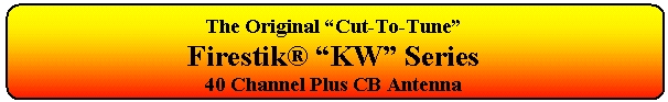 The "KW" antennas are 100% American made with 100% American materials. To maintain a balance between flexibility and ruggedness, we use a custom blended, glass fiber reinforced shaft. Each is wound with heavy insulated copper wire to prevent the oxidation and shorted windings often found on non-Firestik antennas. The 3/8"-24 threaded base has a tapered contact point that works especially well with Firestik mounts and accessories. The tapered "lug-nut" effect transfers stress away from the threads and reduces the possibility of vibration induced loosening of the antenna in its mount. Each antenna is covered with a static reducing, water-tight sleeve containing UV and pigment stabilizers. For peak performance we recommend that you use one of our 18-foot Fire-Flex coaxial cables with these antennas. All "KW" series antennas are factory bench tested for resonant frequency and overall quality. They are available in four (4) standard colors .. Black or White with a red tip, or Red or Blue with a white tip. WHERE TO BUY? And don't forget ... ALL antennas, regardless of style or manufacturer, MUST be tuned after installation on the vehicle. Transmitting antennas are not "plug-n-play" devices. Read our article regarding this matter. Also, visit our technical library to find the answers to your most common questions or to learn how to troubleshoot and tune your CB antenna. It is unique on the Internet!