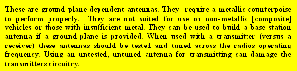 Like all transmitting antennas, these antennas work best when mounted over sufficient ground plane. The versitility of the tuning screw design offers a wide tuning range. The lowest frequency is achieved by having the tuning screw in its highest lockable position and the vinyl cap installed. Likewise, the highest frequency of the antenna can be found with both the vinyl cap and tuning mechanism removed. During design testing we were able to achieve resonance from 138.200 to 171.720 MHz without exceeding our maximum threshhold SWR of 2.0:1. In the 151.820 - 154.600 MHz MURS band, sub 1.5:1 SWR was easily achieved. The MURS16-B should be selected when the user has no need for the added protection from a spring. However, for roof mounts and others that place the antenna in a location whereas physical contact with immovable objects is probable, the MURS16S-B would be the proper choice. The MURS16S-B antenna production length is factory adjusted to compensate for the stainless steel spring. WHERE TO BUY? Visit our technical library to find the answers to the most common questions or to learn how to troubleshoot or even tune your antenna. It is unique on the Internet!