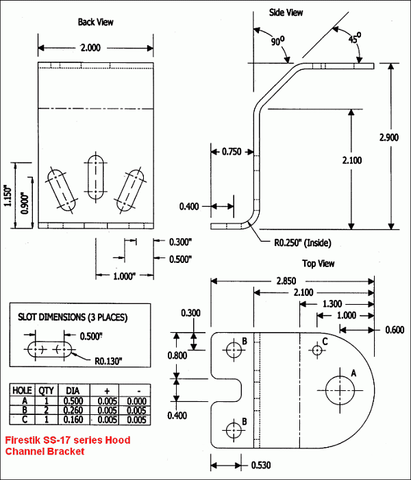 Designed for hood and trunk applications, these stainless steel mounts go on the inside channel of your hood or trunk. There are no visible mounting holes required. All mounting hardware (also stainless steel) is hidden inside the hood or trunk channel. Includes four #12 x 1/2" Philips panhead stainless steel sheet metal screws (use a #20, 0.161" drill for the screw pilot holes). Mount comes complete with antenna mounting stud. Click here to see installation line art. The SS-174 fits well in the deeper hood channels found on many of the newer Ford and Chevy pick-ups. This mount isn't limited to pick-ups. It can be used on just about any vehicle with a hood and/or trunk. The bracket measures 2.9" (74cm) from the mounting base to the top of the bracket itself. The height from the mounting base to the first bend is 2.1" (53mm) so it can be used on channels with depths up to 2" (51mm). This bracket is also available in one of our cable/mount mini-kits. See MK-174. Click here to see dimension details. Use this mount with heavy-duty Firestik, FireFly or RoadPal antennas up to 48" (122cm)