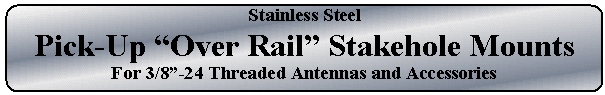 This stainless steel mount locks into any of the stake hole pockets along the edge of a pick-up truck bed. There is no need to drill any holes in the vehicle. The mount can be used on bed rails with protective covers (such as those on the newer Ford Super-Duty trucks). Because of the stud mount configuration on this mount, it can only be used on trucks where there is inside access to the stake hole pocket (from side or bottom) for the coaxial cable to be routed to the mount. In some cases, this might require that the coax be routed through an opening that is too small for a PL-259 connector to pass. In those cases, the PL-259 will need to be installed after the coax has been routed. The mount will easily support heavy-duty antennas up to 4 feet (1.2m) in length. Click here to outer bracket dimension details. Click here to see clamp bracket dimension details. Note: With the exception of being able to correct for slight bed rail tilt using gasket material or a fabricated wedge of sorts, this mount does not contain angular adjustments. The top of the bed rail needs to be close to the horizontal plane to prevent the antenna from leaning inward or outward when viewed from the front or back of the vehicle.