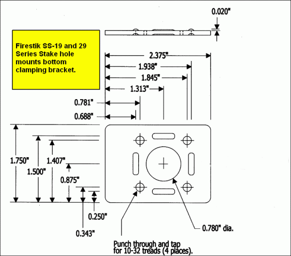 The mount comes complete with our world famous heavy-duty SO-239 antenna stud. Standard PL-259 terminated coaxial cables are to be used with this mount. Firestik recommends the use of 18ft (5.5m) RG-58A/U high quality coaxial cable with all of their fiberglass antennas. Coaxial cable assembly model K-8A would be the recommended cable to use with this mount when using a single antenna or, model K-9A if running twin (co-phased)antennas. If you do not have inside access to the stake hole pocket, Firestik also manufactures a mount and coaxial cable mini-kit for this type of installations. The mini-kit features the low-profile Firestik exclusive FireRing terminated coaxial cable. To review the mini-kit, click here.