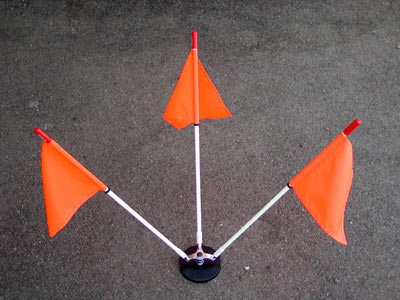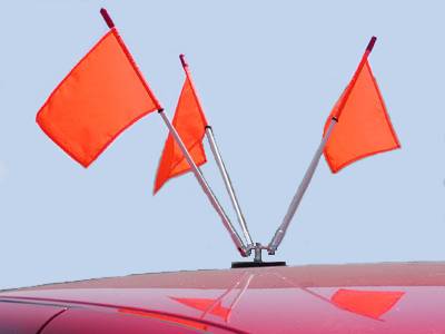 Removable, triple-flag escort vehicle assembly. Mounting base is a 4.9 inch (124mm) steel cup with 0.5" thick ferrite magnet. Magnet assembly is rated at 200 lbs pull. Our exclusive tri-bracket is used to position the three, 24" (61cm) flag sticks. Flag sticks are solid 3/8 fiberglass and are covered with UV stabilized shrink tubing that protect the fiberglass and prevents handlers from acquiring unwanted splinters. Includes three 8" x 12" safety-orange flags.
